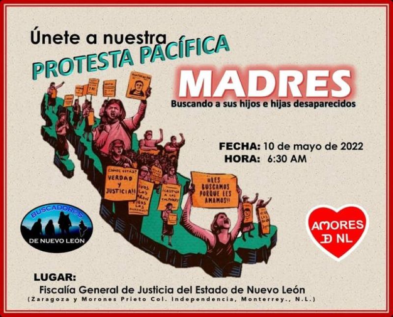 Los colectivos se pararán, a las 7 de la mañana, frente a la Fiscalía General de Justicia de Nuevo León (en Zaragoza y Morones Prieto, en la colonia Independencia de Monterrey) para manifestar su exigencia de justicia y exigir la localización de hijos e hijas. Las madres de los colectivos “Amores” y Buscadoras en apoyo de diferentes Colectivos de Nuevo León, alzarán la voz para exigir busquen y encuentren a sus hijas e hijos desaparecidos.