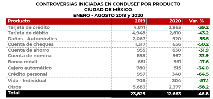 Los productos más reclamados en la Ciudad de México fueron: Tarjeta de crédito, Tarjeta de débito, Daños automóviles y Cuenta de cheques que en conjunto representaron el 58.0% del total de las controversias, sin embargo, todos mostraron un decremento respecto al mismo periodo de 2019.