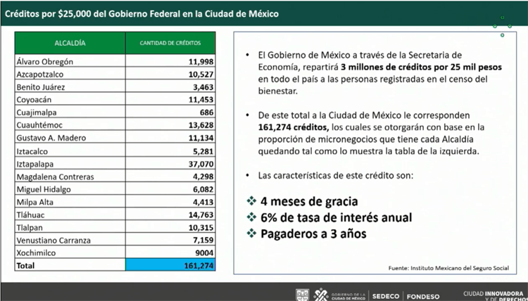 Además, el Gobierno federal, a través de la Secretaría de Economía, repartirá 161 mil 274 créditos —de 25 mil pesos cada uno— para negocios de la Ciudad de México. Estos tienen una tasa de interés de 6 por ciento, pagaderos a tres años y con cuatro meses de gracia.
