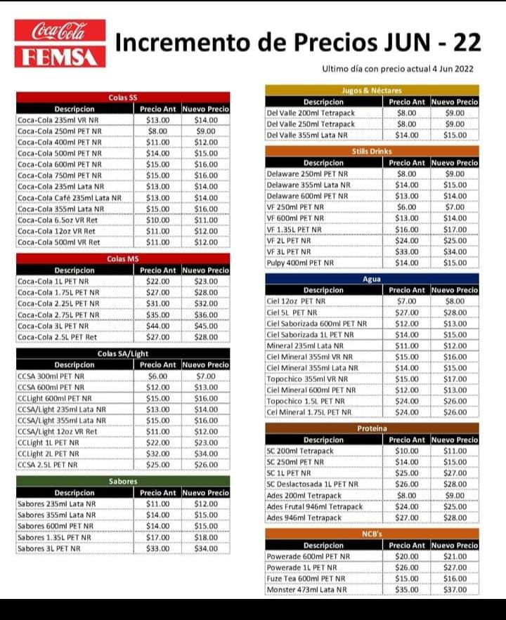 Todas las presentaciones de Coca-Cola, agua Ciel, jugos Del Valle, agua mineral Topo Chico, entre otros productos, registrarán aumento de precios, en un contexto de elevada inflación así como presiones en los precios de las materias primas.