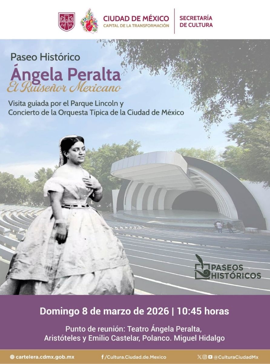 La cartelera inicia el 8 de marzo en Polanco con el recorrido “Ángela Peralta. El ruiseñor mexicano”, un homenaje a la célebre soprano del siglo XIX que tendrá como punto de reunión la esquina de Aristóteles y Emilio Castelar a las 10:45 horas. Los visitantes conocerán el Teatro Ángela Peralta, una concha acústica de 1938 inspirada en el Hollywood Bowl, donde la Orquesta Típica de la Ciudad de México ofrecerá un concierto especial para engalanar la mañana en el Parque Lincoln.