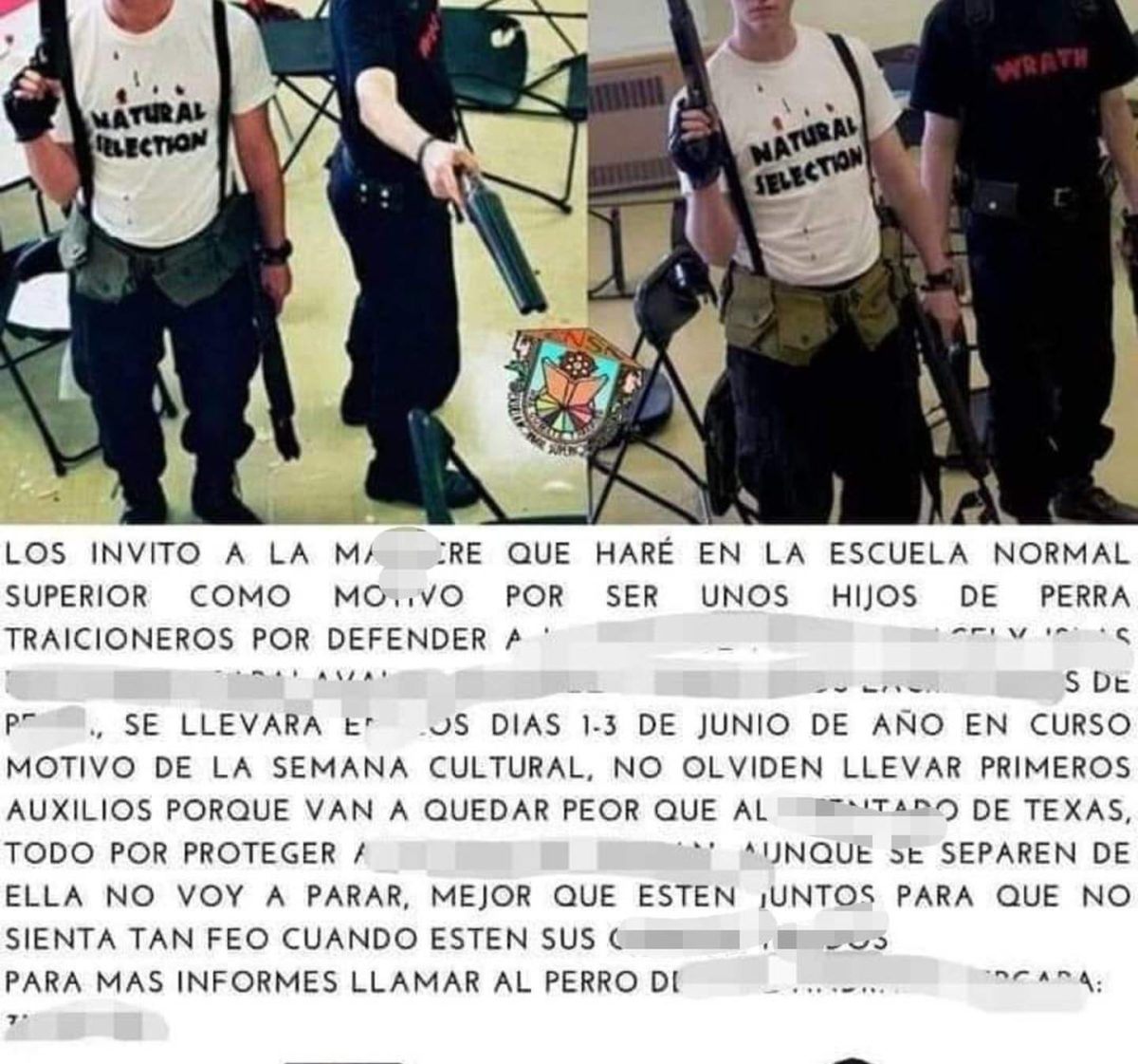 Asimismo, Luis Alexander “N” amenazó a la comunidad estudiantil con que llevaría a cabo una masacre durante la semana cultural de la institución -que se presentaría del 1 al 3 de junio- a semejanza con los recientes ataques en Texas; advirtiendo que afectaría a la joven antes mencionada y a una persona más, de quien además distribuyó su contacto.