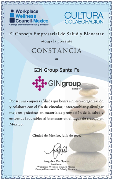 Ciudad de México, a 5 de agosto.- A través de su Centro Operativo Santa Fe, la empresa GINgroup, especialista en talento humano, que preside el mexicano Dr. Raúl Beyruti Sánchez, recibió esta semana, el Distintivo Organización Responsable Saludable, ORS® otorgado por el Consejo Empresarial de Salud y Bienestar (CESSyB), por el desarrollo de sus diferentes iniciativas en bienestar integral.