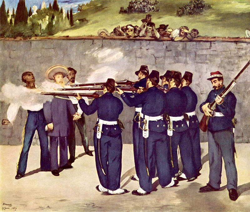La ejecución de Maximiliano de Edouard Manet (1867). El artista pintó tres versiones, todas censuradas en Francia por razones políticas y una de ellas seccionada y recuperada entre 1890 y 1912 por Edgar Degas. Hoy se exhiben los fragmentos en la Galería Nacional de Londres.