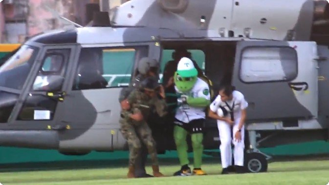 El traslado en helicóptero oficial -de la mascota de Olmecas de Tabasco-, escuadra de ‘sus amores’ del presidente López Obrador, formó parte de la ceremonia de la inauguración del evento.