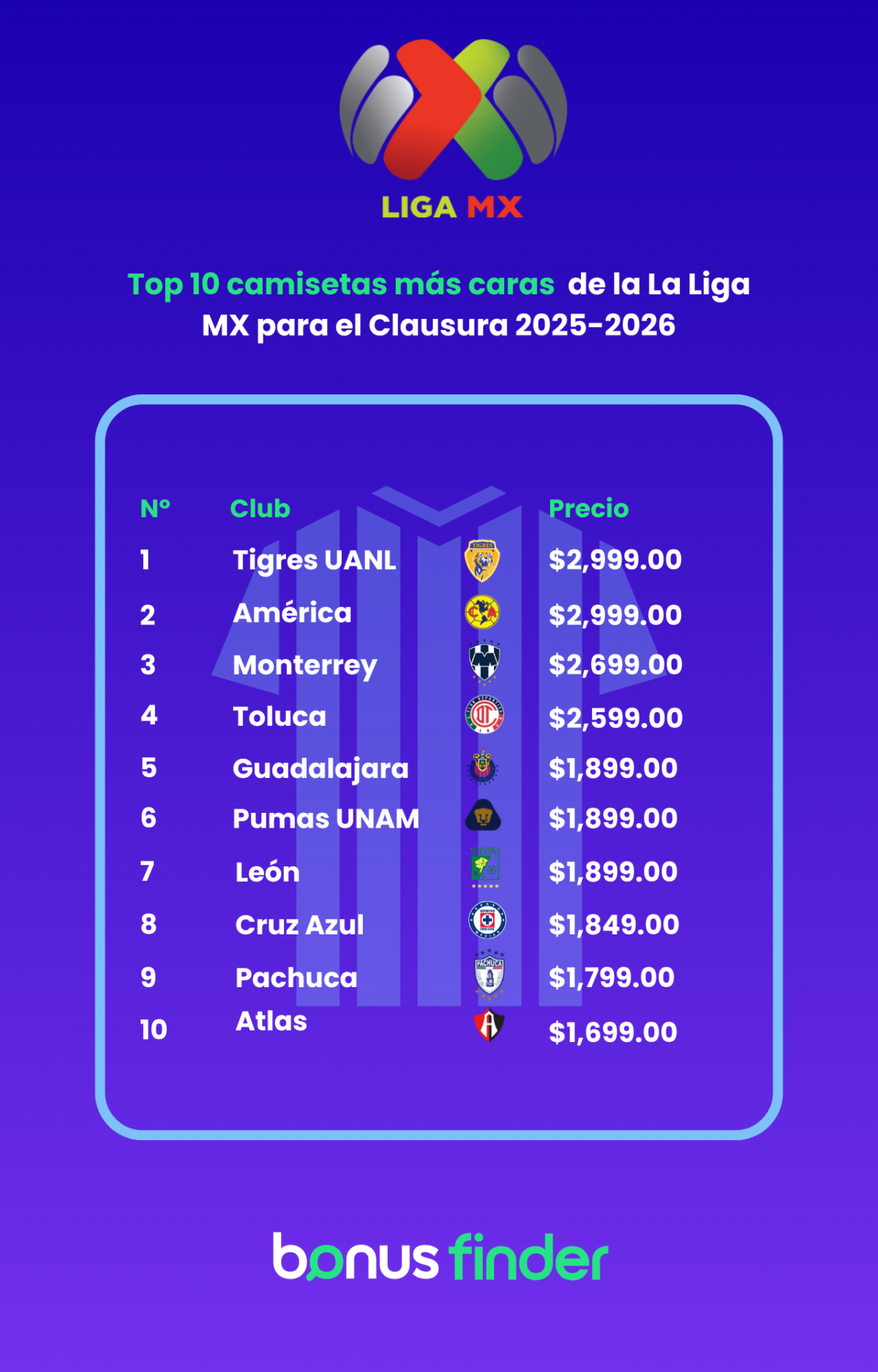 BonusFinder México reveló que vestir la camiseta oficial de los equipos de la Liga MX puede costar desde $1,399 hasta $2,999 pesos, dependiendo del club. El estudio comparó exclusivamente las camisetas de local para hombre en tiendas oficiales, mostrando una brecha de más de $1,500 pesos entre la más cara y la más barata