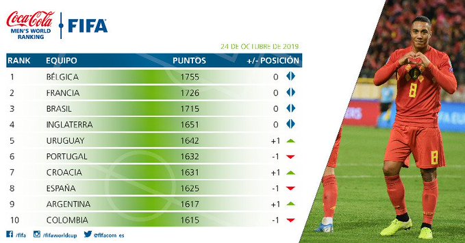 No se registró movimiento en los primeros cuatro lugares: Bélgica se mantiene en el primer puesto, seguido de Francia, Brasil e Inglaterra; mientras que Uruguay aparece en el quinto. En sexto lugar aparece Portugal, que descendió un escalón. Croacia es séptimo, mientras que España, Argentina y Colombia, completan el ‘Top Ten’ del ranking de octubre.