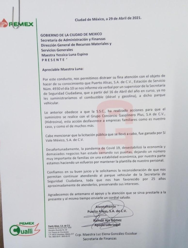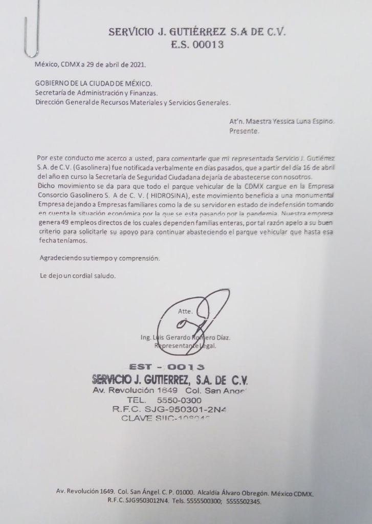 La empresa Servicio J. Gutiérrez señaló en un documento enviado a la Secretaría de Administración y Finanzas de la CDMX que fueron notificados verbalmente que a partir del 16 de abril, que la SSC dejaría de abastecerse de combustible en sus gasolineras.