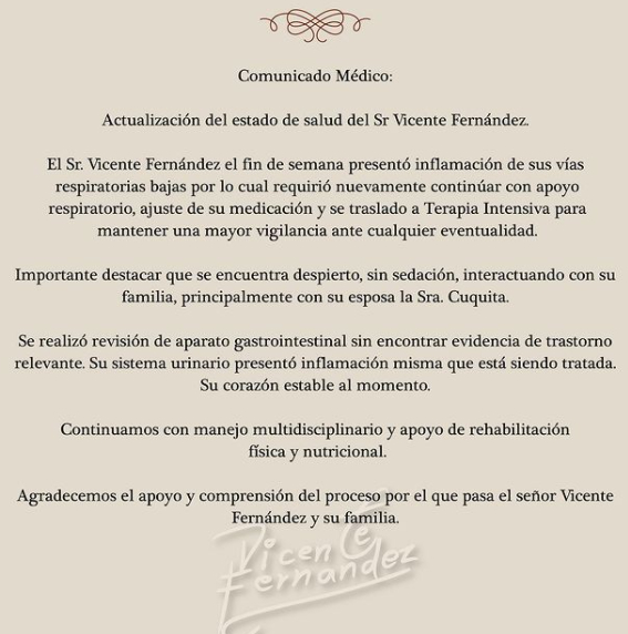“Continuamos con manejo multidisciplinario y apoyo de rehabilitación física y nutricional. Agradecemos el apoyo y comprensión del proceso por el que pasa el señor Vicente Fernández y su familia”.